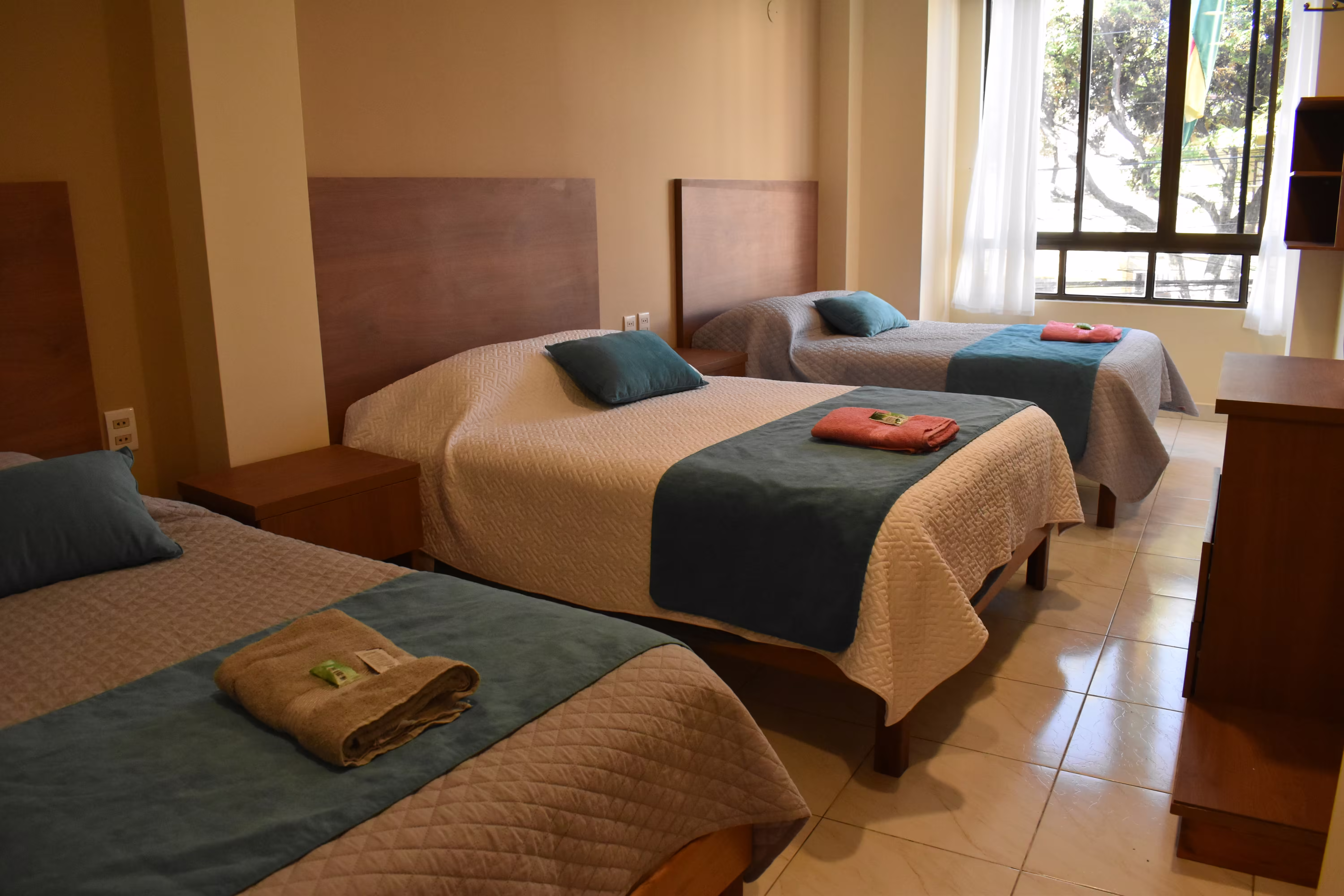 Habitación triple con camas confortables, ideal para familias o grupos pequeños que buscan comodidad en el centro de Sucre.